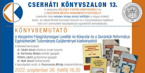 A veszprémi Kölcsey Ferenc Könyvesboltban a Veszprém Megyei Honismereti Egyesület szervezésében 2022. szeptember 26-án, hétfőn 16.30-kor Veszprém megye két egyházi gyűjteménye-kiadója mutatkozik be: a Dunántúli Református Egyházkerület Tudományos Gyűjteményei (képviseli: Köntös László gyűjteményi igazgató és Dr. Hudi József levéltárvezető), illetve a Veszprémi Főegyházmegyei Könyvtár és Levéltár (képviseli: Dr. Takáts István érseki általános helynök és Dr. Karlinszky Balázs igazgató). A beszélgetést Dr. Praznovszky Mihály irodalomtörténész vezeti.