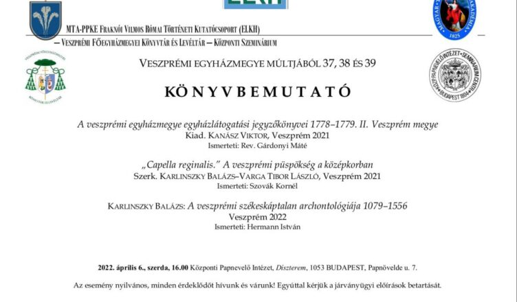 A Veszprémi egyházmegye múltjából sorozat 37., 38. és 39. köteteinek bemutatója az MTA–PPKE Fraknói Vilmos Római Történeti Kutatócsoport, a Veszprémi Főegyházmegyei Könyvtár és Levéltár és a Központi Szeminárium szervezésében 2022. április 6-án lesz.